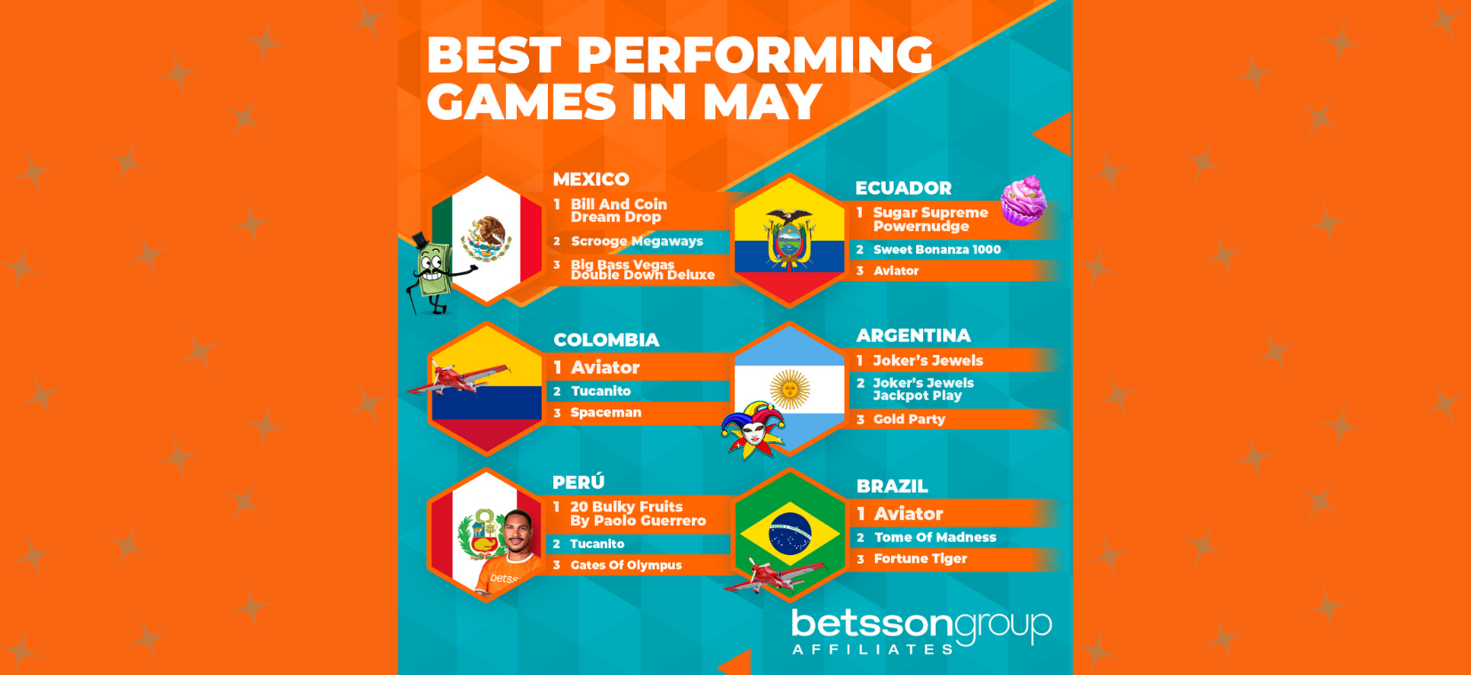 As we do every month, we, at Casin.com, the leading online casino portal, once again turn our attention to the Latin American market, where Betsson brings us the latest data – this time revealing the top-performing games for May 2025. This month reflects a continuation of trends observed in April: slot games remain the dominant force across all countries, and table games continue to be absent from the top three. While mainstays like Aviator and Joker’s Jewels maintain their grip on regional rankings, May also introduces new slot contenders like Bill and Coin Dream Drop in Mexico.